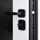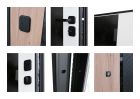 Наружный лист металла 1,5 мм. Панель МДФ 10 мм. Объемная фрезеровка. Цветовая комбинация: “дуб галиф натур”, “шагрень черная”. Декоративная пластиковая вставка, цвет "черный". Наличник МДФ 80 мм., цвет “черный кварц”.